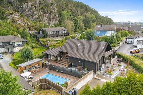 Flott enebolig over 3 plan i populært boligområde - Fin tomt med svømmebasseng og gode solforhold - God standard!