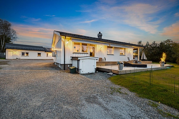 Eiendommen er omkranset av en velstelt hage på 2020 kvm, med to store solrike terrasser på hhv. 70 og 20 kvm.