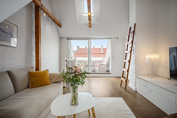 - Klassiske detaljer som synlig teglstein og bærebjelker, og generøs takhøyde på 2,71 kvm i 4. et og 4, 02 på loftet