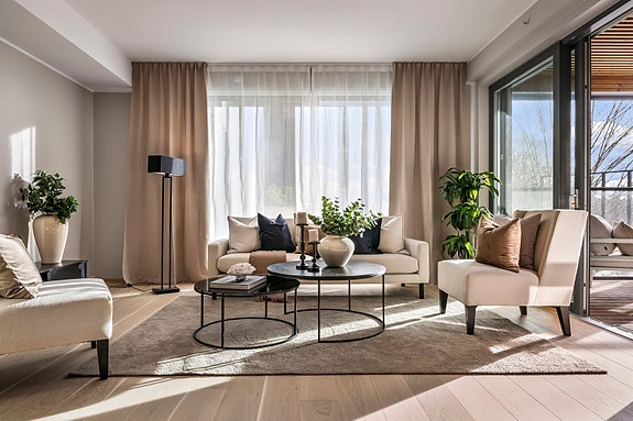 Inne fremstår leiligheten med smakfulle farge- og materialvalg, god standard og fin planløsning. Her er det åpen stue-/kjøkkenløsning, og kjøkkenet fra Sigdal er velutstyrt med bla.a Miele hvitevarer. Videre har leiligheten 2 helflisede bad/vaskerom, en pen entré og 2 soverom.