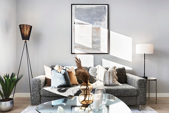 Her får du en moderne, klassisk leilighet med stor takhøyde og praktisk planløsning