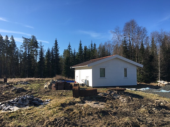 Det var et gammelt hus og uthus på eiendommen. Jeg rev begge av. Det er nå et nytt isolert uthus ferdig bygget i 2024 med 50m2 bebygget areal på eiendommen.