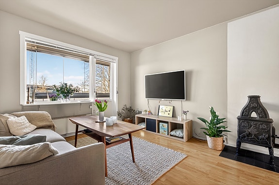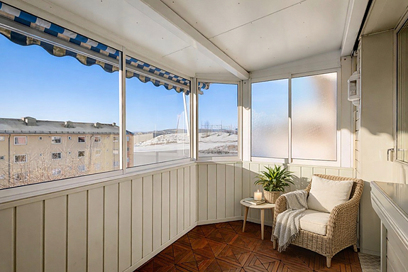 Leilighet i toppetasjen med innglasset balkong og felles grøntarealer.