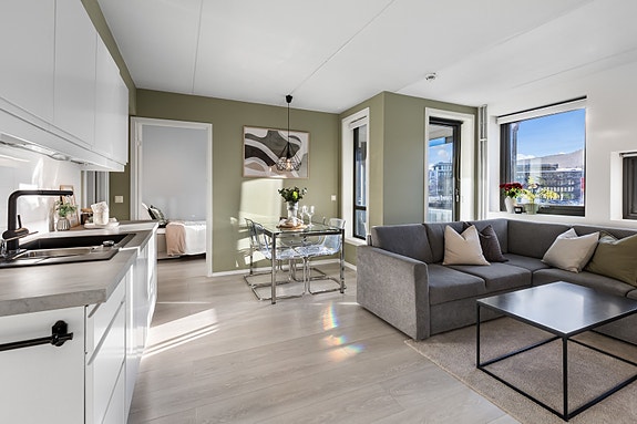 Velkommen til en meget pen og gjennomført 3-roms andelsleilighet på hjørnet i 2. etasje, med svært sentral og attraktiv beliggenhet. Her bor man i et urbant område i stadig utvikling, med et rikt utvalg butikker, barer, kafeer og restauranter. Alt er tilrettelagt for en enkel hverdag, med heisadkomst og parkering i carport. Utenfor stuen har leiligheten en innglasset balkong på ca. 11 kvm, der vinduene skyves til side slik at sommeren slipper helt inn.