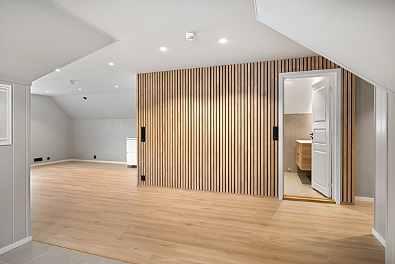 Overflater og innredning er holdt i lyse, delikate farger. Behagelig lyssetting med downlights i himling. Parkering på egen grunn.