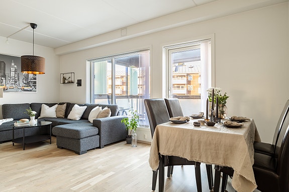 Leiligheten har store vindusflater som slipper inn mye naturlig lys.