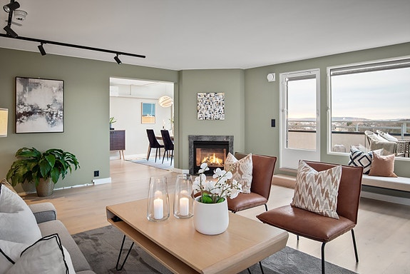 Utsiktsleilighet med garasjeplass og to terrasser | Tre sov og to bad | Heis | Solrikt og utsikt mot Frognerparken
