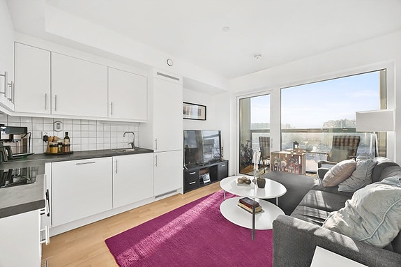 Leiligheten har en fin og åpen planløsning med store vindusflater samt direkte tilgang til en flott innglasset balkong med nydelig utsikt.