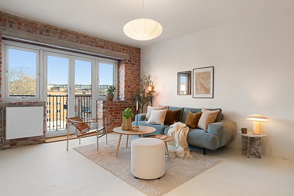 • Romslig stue med stilig kontrastvegg av teglstein, praktisk hyllemøbel, samt god plass til spisebord, sofagruppe og annet møblement