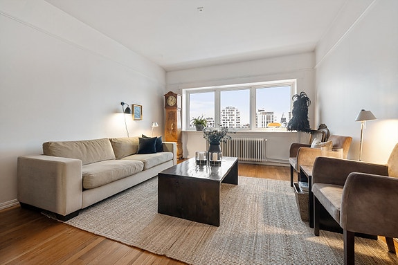 Du bor midt i Oslo, med kort gangavstand til T-bane, Bogstadveien, Colosseum og Frognerparken. Leiligheten har en åpen og gjennomgående planløsning, med stor stue, separat kjøkken, to gode soverom og et lekkert flislagt bad. Fra 7. etasje får du en imponerende utsikt mot Oslofjorden fra stuen og Grefsenkollen fra kjøkkenet.