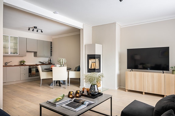 - Store vindusflater og generøs takhøyde gir leiligheten en lys og fin atmosfære