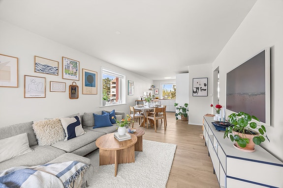 Romslig stue med lyse gulv og direkte tilgang til terrasse.