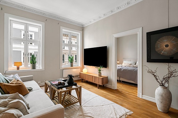 - Klassiske detaljer som store vinduer med dype vinduskarmer og stukkatur