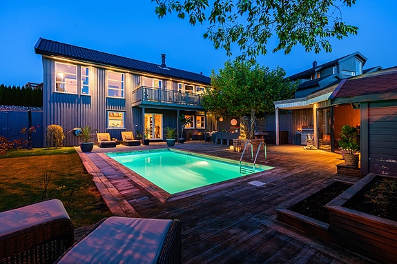 Stor innholdsrik enebolig fra 2011 med tilbygg fra 2023. Nydelig usjenert uteområde med basseng, grillbu og gode solforhold. Boligen har også separat 3-roms utleiedel og dobbelgarasje. Lys og fin stue med store vindusflater og god takhøyde, med åpen løsning til lekkert og godt utstyrt kjøkken fra HTH. Gjennomgående peis fra kjøkken til spisestue, og ny varmepumpe i trapperom. Det er tilsammen 6 soverom og tre bad. I tilbygget er det en ny stor "suite" med helt nytt bad 2024/2025 og romslig garderobe. Nytt stort vaskerom/bad med innredning og benkeplass, og verksted/bod er brukt til treningsrom. Det er ellers bad med dobbel dusj og badekar i tillegg til gjesterom, to flotte barnerom og TV-stue med vedovn og utgang til uteplassen.