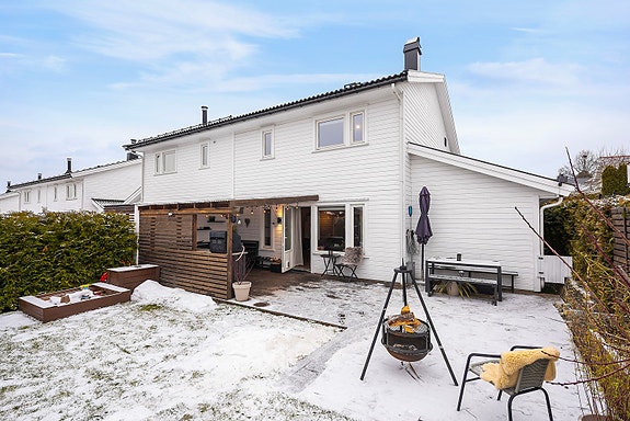 Stuen er innbydende med peisovn og plass til spisebord, mens kjøkkenet har god skap- og benkeplass. På badet er det gulvvarme og stor dusjnisje med regnfallsdusj, praktisk plassert utenfor tre gode soverom, ett med stor garderobe. Et eget vaskerom har gjestetoalett, og boligen har fin lagringsplass både inne og ute.