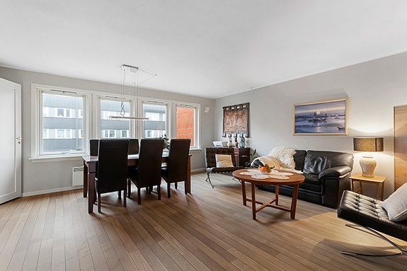 Leiligheten har lyse overflater og pent kjøkken som ble pusset opp i 2022. På samme tid ble det lagt nytt gulv i det meste av leiligheten.