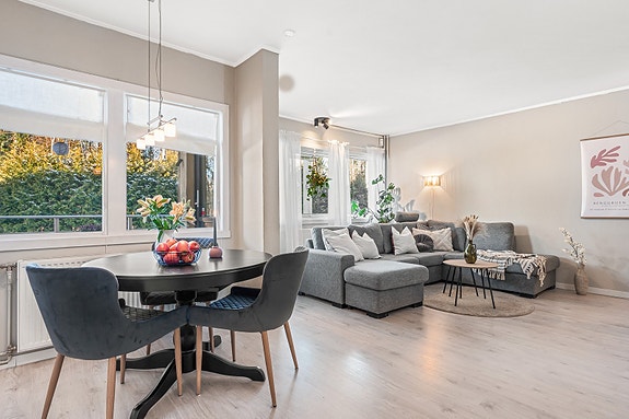 Endeleilighet i 1.etg med veranda på 14m² - Oppvarming inkludert - 2 p-plasser og 8 min. til tog - Rett ved bhg og skole