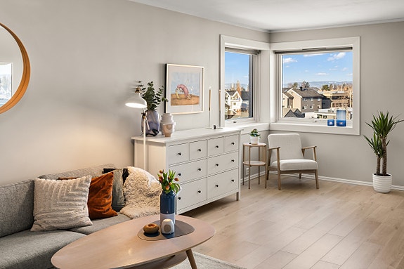 med vidstrakt utsikt og sol til sent på kveld. Innglassingen føres til side når det er ønskelig. Da er det helt åpent. Godt med lagringsplass i tre boder. Leiligheten fremstår som moderne med farger og innredning i en lys og tidløs stil.