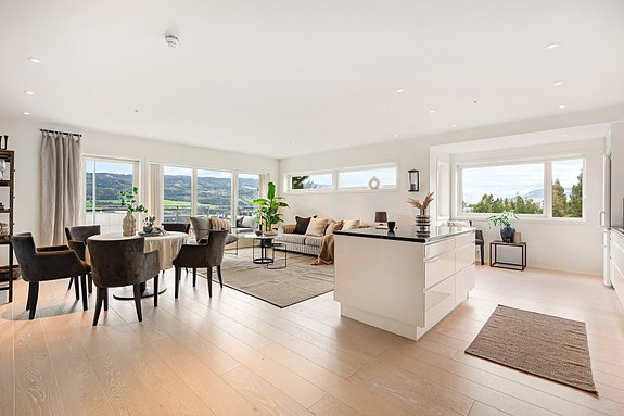 Velkommen til denne toppleiligheten i Smestadenga 15 - Stue og kjøkken har en åpen løsning. Dels noe adskilt med kjøkkenøy med sitteplasser.