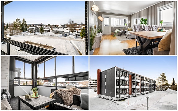Lys og hyggelig 4-roms topp-/endeleilighet med solrik innglasset balkong mot vest. Garasjeleie etter liste. Fjernvarme!