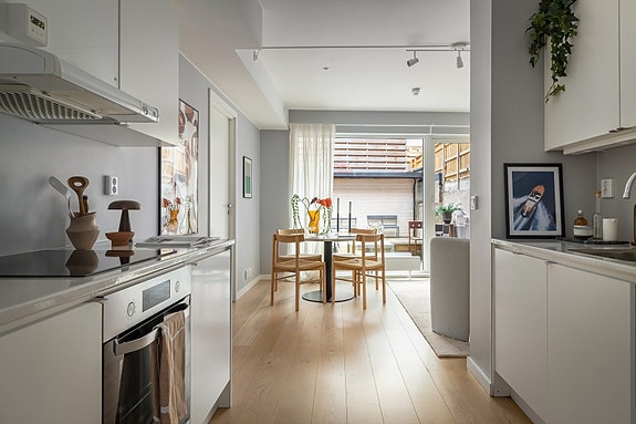 Her får dere en lys, gjennomgående leilighet med god standard og sentral beliggenhet.