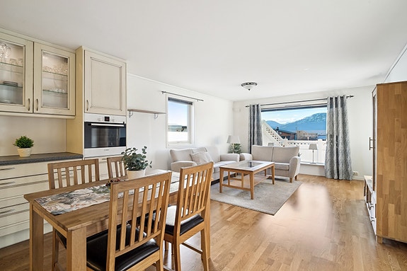 Leiligheten ligger i 1.etasje mot sør og inneholder: Entré, stue/kjøkken, bad, bad/vaskerom, 3 soverom og bod. Utgang fra stue til solrik terrasse.