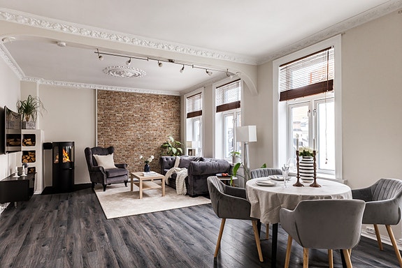 116 kvm toppleilighet på ett plan med 2 bad /​ 3 soverom i eldre gård fra 1898. God planløsning. Peisovn.