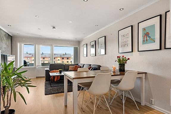 Boligen fremstår som innbydende med moderne fargevalg, gjennomtenkt planløsning og gode oppbevaringsmuligheter.