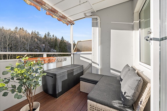 - Solrik balkong med utsikt mot marka