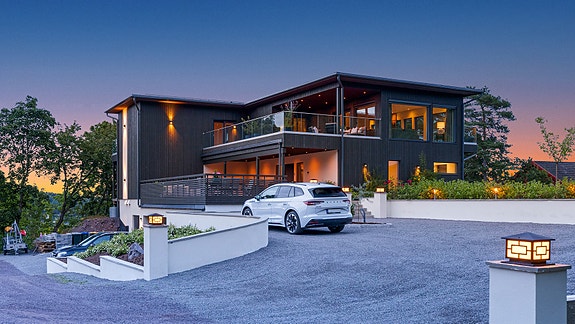 Her er farge- og materialvalg gjennomført til fingerspissene med god planløsning og moderne innredning. Her får du vinduer fra gulv-til-tak og åpne rom som gir en lys og luftig atmosfære. Boligen byr blant annet på tre soverom, treningsrom, kinorom, flere stuer, kontor og et delikat kjøkken.