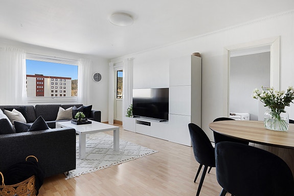 En lys og romslig 3-roms leilighet med populær beliggenhet. Leiligheten ligger i byggets 8. etasje og har god planløsning. Fra stuen har man tilgang til en innglasset balkong på 5m² med vakker utsikt og gode solforhold. I tillegg disponerer leiligheten en bod i samme etasje og en kjellerbod på totalt 4m².