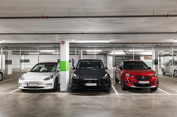 Garasjeplass med elbillader i lukket og oppvarmet garasje