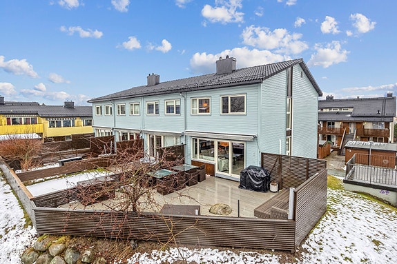 Flott og innholdsrikt rekkehus over tre plan | Endebeliggenhet | To uteplasser med gode solforhold | Kort vei til "alt"