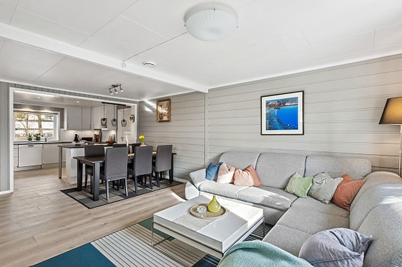 Boligen går over 1 etasje og inneholder romslig kjøkken med god plass til spisebord. Stuen er stor og i vinkel, med plass til både tv-stue og salong. Det er utgang til en solrik terrasse fra stuen. Boligen har to soverom, kontor, baderom, toalettrom og vaskerom. Oppvarming med varmepumpe og klebersteinsovn.