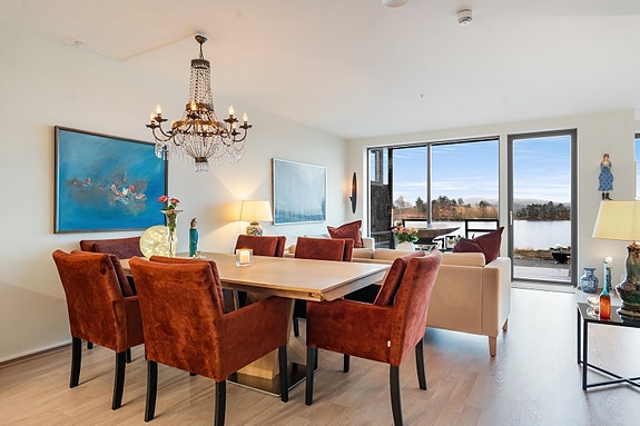 Velkommen til Tysværvegen 23! Enten man sitter ved spisebordet eller en av sittegruppene i stuen, har man en nydelig utsikt!