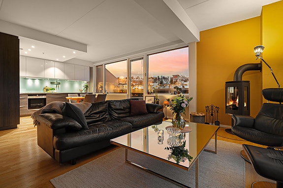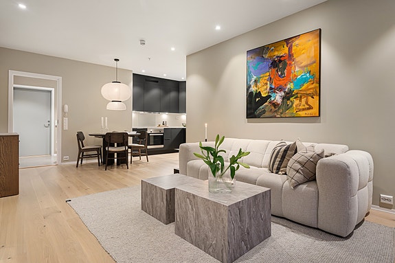 Leiligheten er gjennomført med høy standard i alle valg, og delikate farger, noe som gir en livsstil der komfort møter luksus. Her bor du fint til i byggets 6. etasje med heisadkomst og en 150 kvm stor takterrasse med fantastisk utsikt og sol fra morgen til kveld. Innvendig byr leiligheten på entré, en luftig stue med kjøkken i åpen løsning, 3 soverom av god størrelse, 2 bad, vaskerom og en praktisk bod.