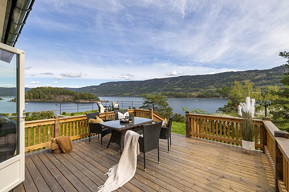 -Stor terrasse på 20 kvm med nydelig utsikt, stor hage og solrik tomt