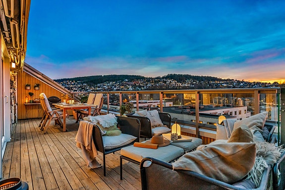 Unik 3-roms leilighet med fantastisk utsikt og solforhold| Uteområder på totalt 38kvm| To garasjeplasser | Lave omkost