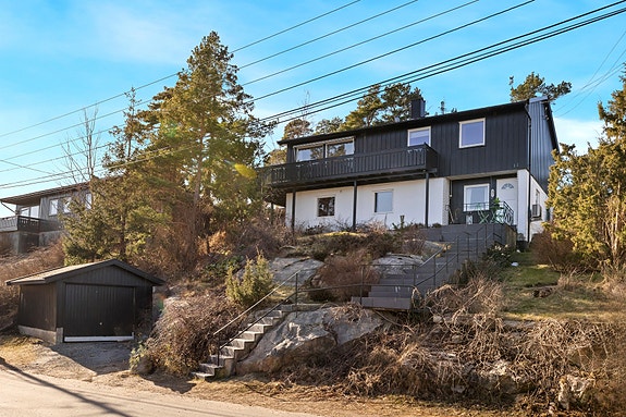 Den solrike tomta har flere fine uteplasser rundt huset, og eiendommen ligger høyt og fint i terrenget på en lettstelt naturtomt.