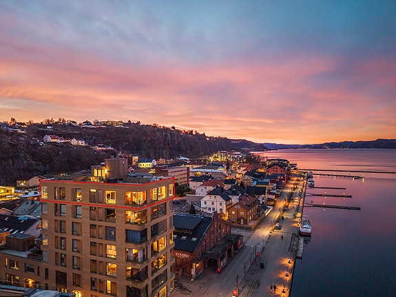 Eksklusiv og rålekker leilighet over en hel etasje med panoramautsikt over fjorden og bryggen, med sol fra morgen til kveld. Denne unike leiligheten har en fantastisk beliggenhet i første rekke på bryggekanten mot fjorden i Holmestrand sentrum. Det er umiddelbar nærhet til butikker, turområder, bademuligheter og togstasjon. Holmestrand er beliggende under 1 time fra Oslo! En luksuriøs og påkostet leilighet med en sensasjonell utsikt, hvor ingenting er overlatt til tilfeldighetene med hensyn til gjennomførelsen. Ingen boplikt.