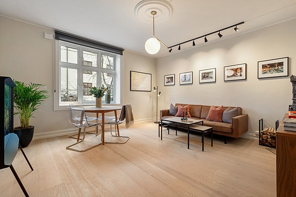 Leiligheten ble i stor grad pusset opp i 2018 og 2020, og oppleves som velholdt og moderne. Her er det mange fine detaljer som rosett i taket, peis og murstein som kommer frem fra en av veggene. Rommene er store og arealeffektive, her er det bare å flytte rett inn!