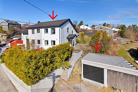 Flott oppusset tomannsbolig over 2 etasjer. Solrik beliggenhet, hage og platting med nydelig utsikt mot byen. Garasje.