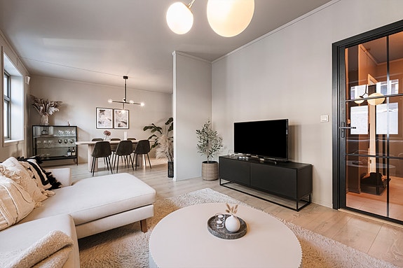 Leiligheten er gjennomført tiltalende og byr på en luftig stue med gasspeis og imponerende takhøyde opp til 4,35 meter, samt et moderne kjøkken med integrerte hvitevarer, loftstue med galleri mot stuen, et lyst bad med opplegg for vaskemaskin og et stort soverom med garderobeskap og fransk balkong. Leiligheten har en innredet bod og flere smarte oppbevaringsløsninger. Varmtvann/fyring er inkl. i felleskostnadene.