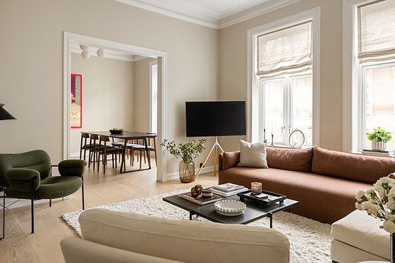 En klassisk og påkostet leilighet med tilbaketrukken og rolig beliggenhet i Vika. Leiligheten er betydelig oppgradert i 2024 og utmerker seg med en høy standard, påkostede kvalitetsmaterialer og gjennomtenkte løsninger. Videre kan leiligheten skilte med gode fasiliteter som stor balkong, klassiske detaljer, store oppholdsrom og moderne peis.