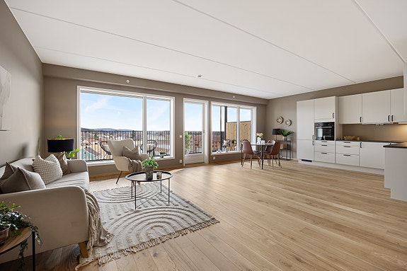 Allerede når man kommer inn i leiligheten legger man merke til den flotte utsikten gjennom de store vinduene i stuen. Stue og kjøkken i åpen løsning danner et sosialt allrom med plass til spisestue og sittegruppe, og herfra er det utgang til en sydvendt balkong på romslige 24 kvm med langstrakt utsikt. Kjøkkenet har tilvalg med ekstra overskap og ekstra høyskap med stekeovn i en god arbeidshøyde.
