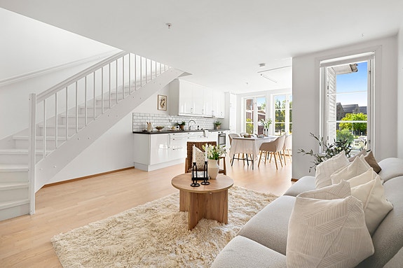 Meget tiltalende leilighet med sjarm og stil. Bygget ble omfattende renovert i 2012, hvor denne leiligheten er ny i 2012 og ligger i byggets to øverste etasjer. Et lys og luftig hjem med særegne takvinkler, flere overlysvinduer og en privat takterrasse. Takterrassen har sol fra tidlig morgen til sent om kvelden og byr på fint utsyn over nabolaget. Beliggenheten er meget attraktiv, rett ved Badedammen og med ca. 10 min gange inn til sentrum.