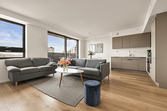 Bygget har heis, felles takterrasse, og i forlengelse av oppholdsrommet kan sommerdager nytes på egen balkong. Stuen ligger i åpen løsning til et velutstyrt kjøkken fra Drømmekjøkkenet. Kjøkkeninnredningen har mørke fronter, benkeplate i laminat og hvitevarer fra Electrolux. Videre er det et delikat bad, to romslige soverom med plass til seng og garderobeløsning, samt entré. Det medfølger en bod i kjeller, og det er mulighet for å leie parkeringsplass i Lux p-hus.