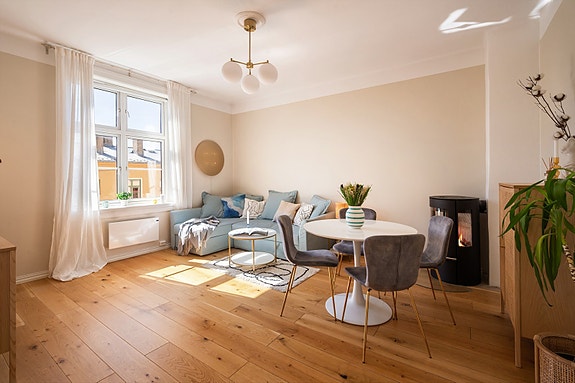 Pen to roms leilighet beliggende i 2. etg. Gjennomgående god standard. Nytt parkett gulv.
