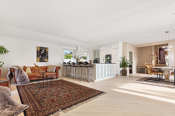 Boligen ble omfattende oppgradert i 2017 og fremstår med høy standard og moderne fasiliteter. Med sine tre adskilte enheter - hoveddelen i første etasje, utleiedelen og en hybel i underetasjen - er fleksibiliteten stor, og alle enheter har egne innganger. Hoveddelen har en lys og romslig stue med åpen kjøkkenløsning og en innbydende spiseplass. Boligen byr på tre oppgraderte bad fra 2017, og en imponerende romfordeling med seks soverom, tre kjøkken, tre stuer og tre bad totalt. For deg som trenger rikelig med lagrings- og parkeringsplass, tilbyr denne eiendommen en romslig dobbelgarasje.