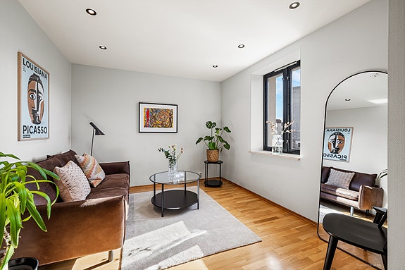Leiligheten er beliggende i byggets toppetasje med balkong.